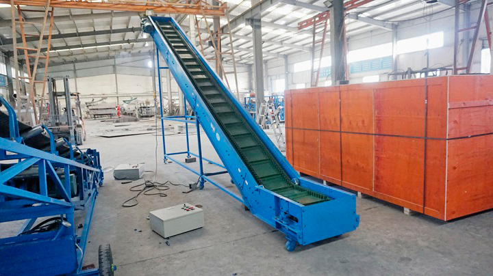 大倾角皮带输送机比之普通皮带输送机采用了波状挡边和横隔板输送带,对于大倾斜角度输送物料有极大的优势,其可实现0°~90°的角度输送。大倾角皮带输送机的型号齐全,主要有带宽400mm,500mm,650mm,800mm,1000mm等多种型号。不同型号对应的输送角度、输送产量均不相同,我们厂家设计这么多的型号,旨在满足用户的多样化输送需求。举个例子,带宽300mm的大倾角皮带输送机,倾斜角度45°的输送产量大11Q3/h,而倾斜角度增大到60°,则输产量有8Q3/h。大倾角皮带输送机的具体参数如下: